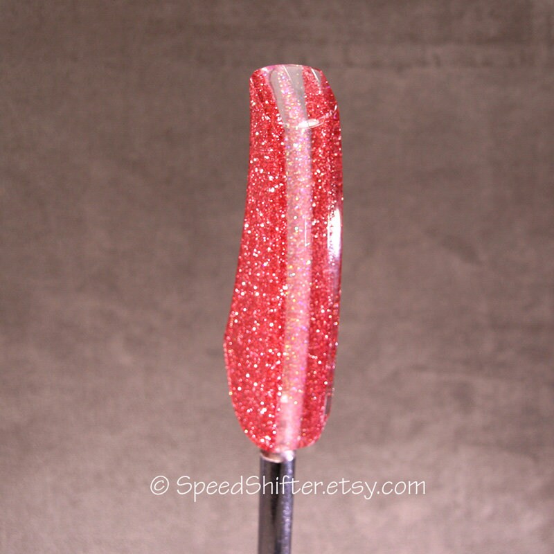 This one has bright copper/pink colored metalflake layers showing on the outside. There is a layer of holographic pink in the middle with clear layers in between. The knob measures 5-1/4” tall, (not including the universal adapter if selected), and 1-3/4” wide x 1-1/8” thick.