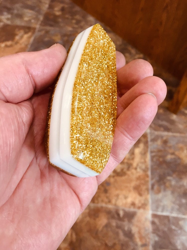 This one has bright gold layers showing on the outside, with white layers and clear layers. The knob measures 4.75” tall, (not including the universal adapter), and 1.5” wide x 1”. With the black universal mount, it would measure 6” tall.
