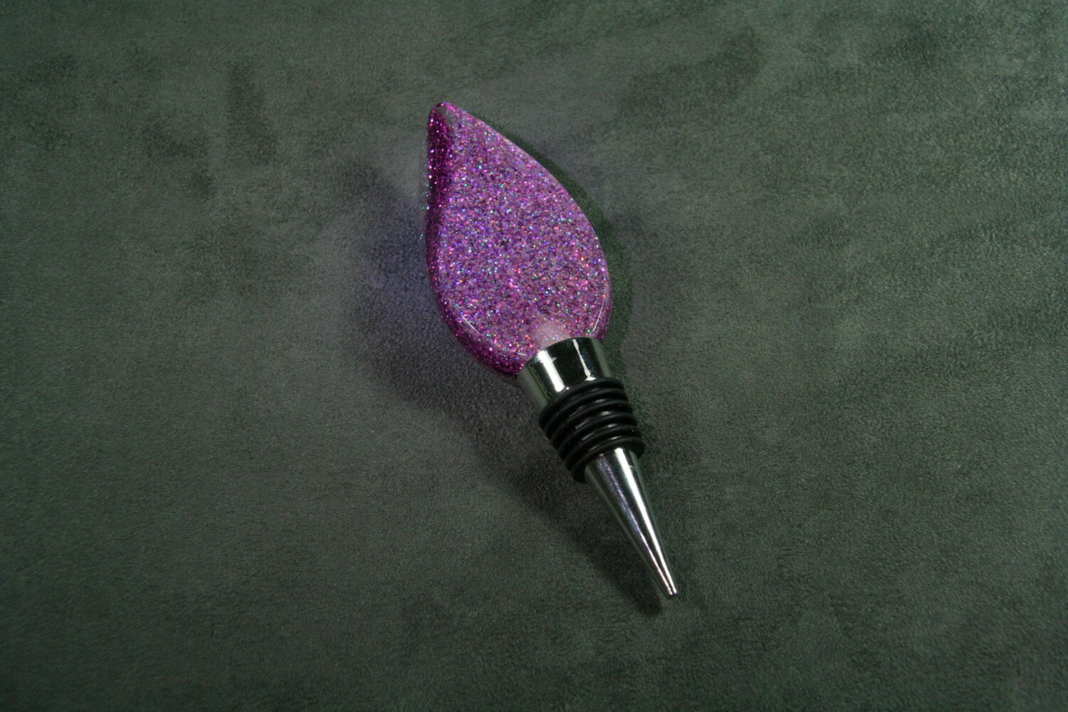 A layer of vivid purple is sandwiched in between layers of clear, with holographic pink layers on the outside. This hand made wine bottle stopper is in a flame shape. It is mounted to a chrome plated stem with soft rubber grip to seal your saved wine.